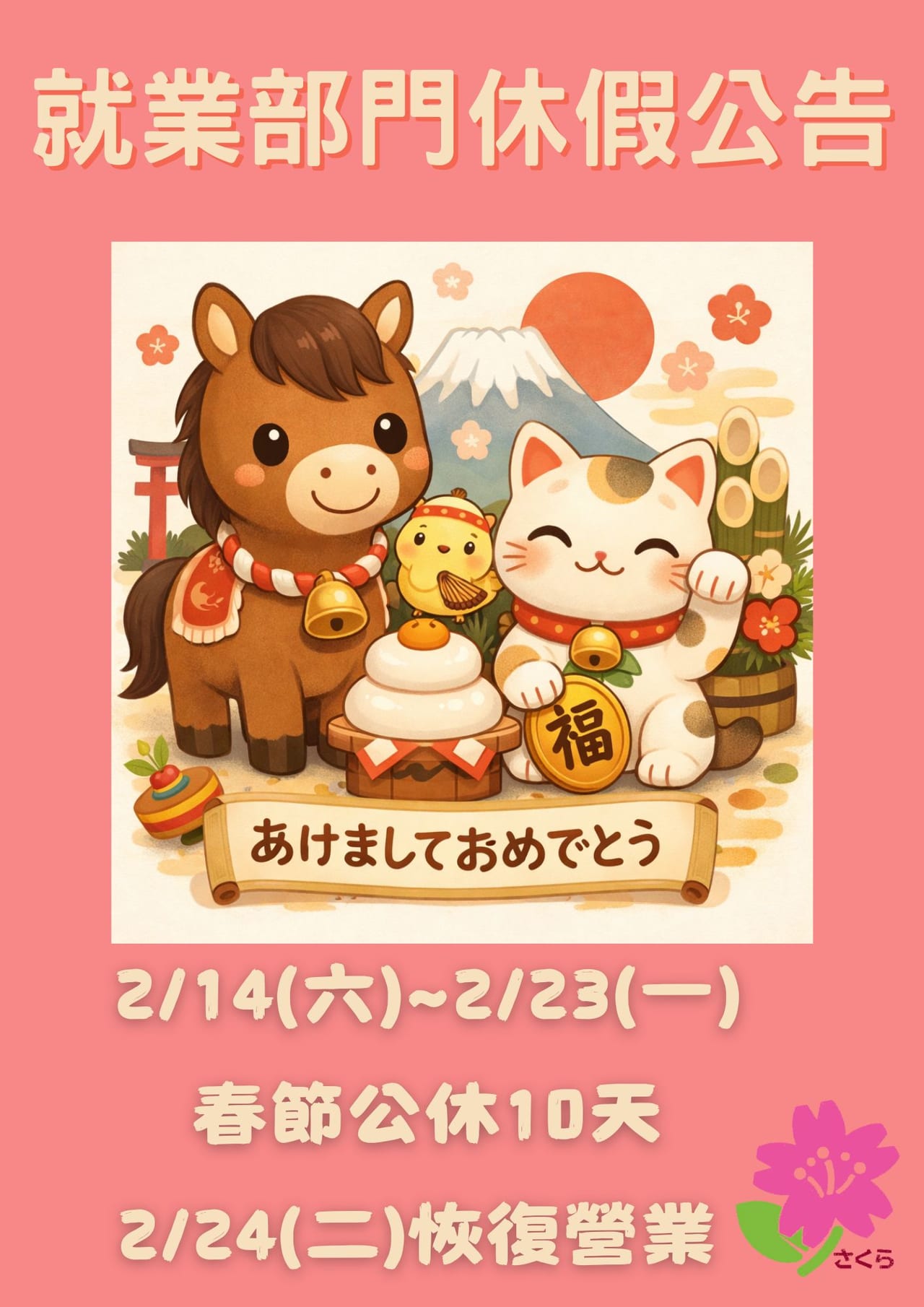 - 春節休假期間2/14(六)~2/23(一) 新年快樂、萬事如意!